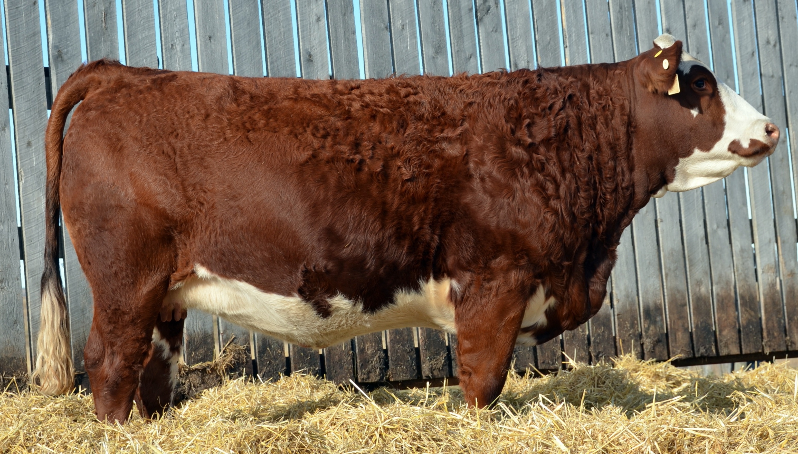 Full Fleckvieh. Heavily pigmented and dark cherry red, Gabrielle combines the legendary Fleckvieh genetics of ABR Sir Arnold’s Image and Sim Roc C&B Western. Gabrielle’s dam, Dora Lee Gretchen, was purchased from Ontario as a heifer calf, and she consistently produced dark red, stylish progeny. We have been very pleased with the consistency of the Samson offspring – his daughters all combine lots of capacity with feminine front ends. Bred early to Pharao, Gabrielle will develop into a deep-bodied herd matron.