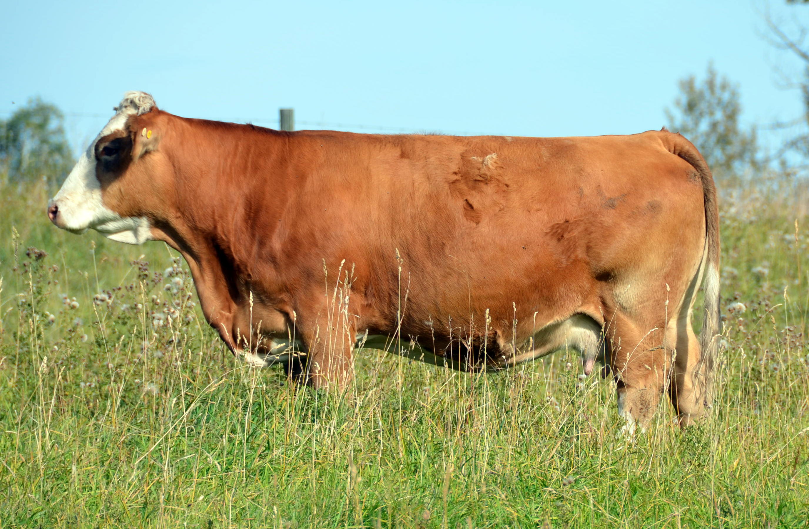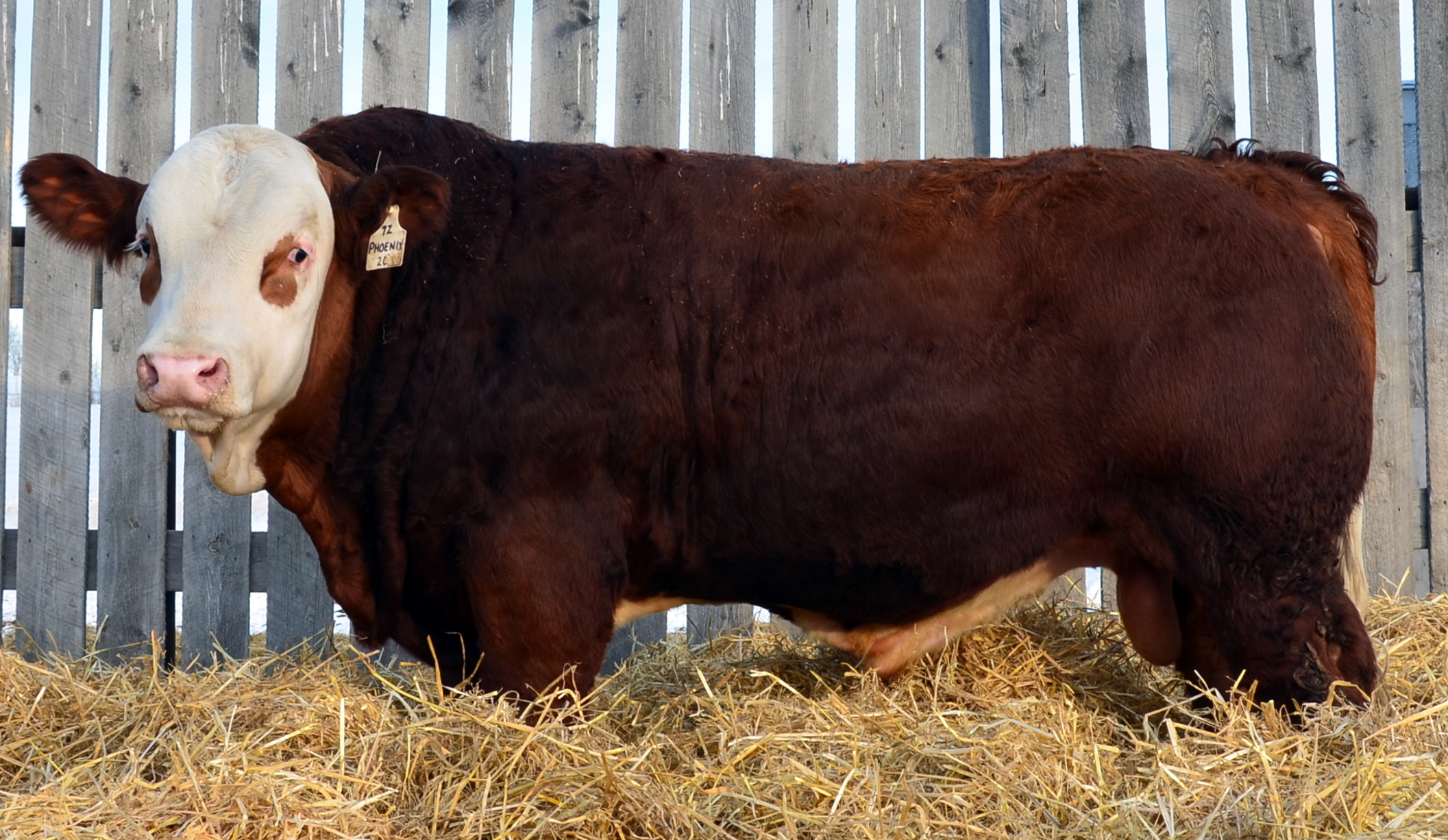 APLX Phoenix 2C is another unique genetic package, with his sire being Dora Lee’s Platinum, a young herd bull developed in Ontario, that was lost too early when he hurt his shoulder breeding cows. To date, Platinum is adding frame to his offspring while also calving very well. Dark red with matching partial goggles, Phoenix has tremendous length of spine wrapped in a double polled package.
