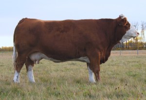 APLX Ensign 2X was sold to Langer Fleckvieh, Pam & Lyle Langer of Edson, Alberta in the 2011 Red Deer Simmental Bull Sale as the high selling Fullblood bull for $8,000. Ensign represented our first sale by public auction, so we were estatic with the result. The combination of a later sale date with a very successful flush program, meant Ensign was only utilized on a limited number of cows his first year out. We had the opportunity to visit with the Langer’s at their ranch near Edson in March of this year, and learned that Ensign’s calves came easily, with all but one being bull calves. We look forward to continuing to watch his genetics develop over time. More pictures of his offspring will hopefully follow.