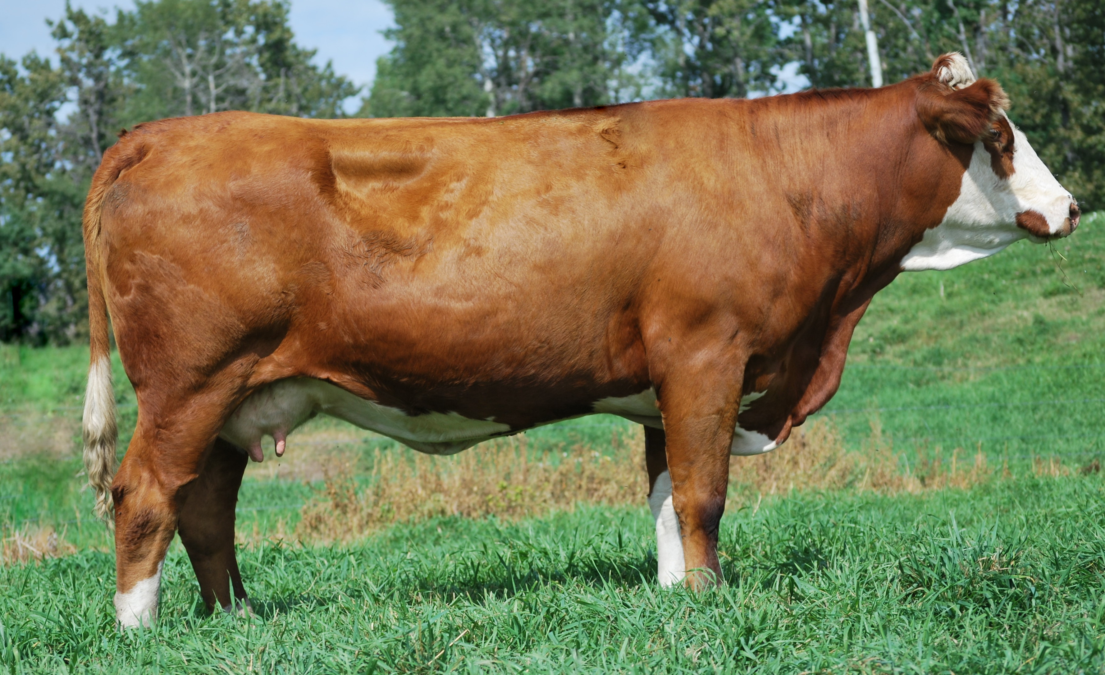 100% Fleckvieh. The incredible volume and capacity of Applecross Iris has stood out since she was just a young calf. The first look says thick and deep, the second says – wow! She’s polled too? We purchased her dam, Beech Bros Imperia, as one of the high-selling open heifers in the 2010 Equation sale and she has matured into a moderate famed, tidy-uddered female that pumps everything she has into her calves. We are quite happy with all of our Pharao daughters – to date they are all developing into easy fleshing, soggy, big volumed individuals – quite the bonus, in a bull we are comfortable using on heifers. We think Iris has the potential to be a special individual. Bred to Dora Lee Eclipse, she will begin delivering on her own legacy in early January.