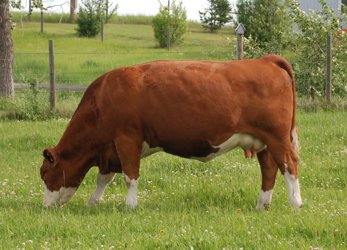 We just love the four quarters of this pedigree—Solway x Holb x Jade x Romulus—the ultimate combination of maternal and paternal power. Christina is a little smaller cow, with only a 5.5 frame score, but she still packs a big punch. She is very thick, very feminine, and an excellent mother. We have 2 of Christina’s daughters working in our herd (both by Dora Lee Eclipse), and her 2011 bull calf by Spruceburn Starfire was purchased by Wayne Falardeau of Wa-Na-Pa-La Simmentals.