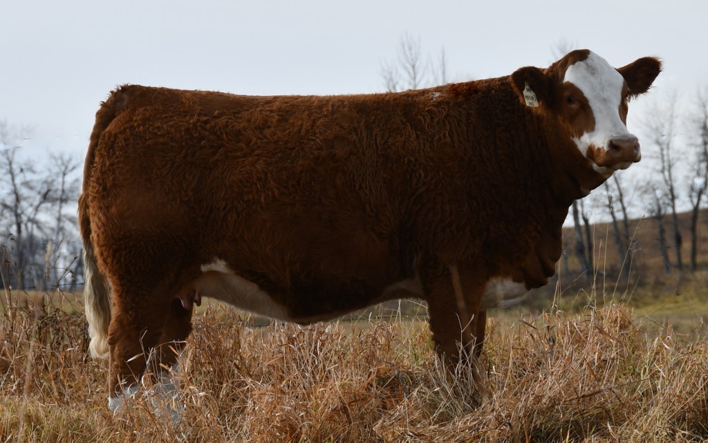 Every year we get asked who is Jeanne’s favourite, and this year that is (as Jeanne would say it,) Cass-i-dee-dee-dee. Quiet as a pet, Cassidy carries substantial volume on a moderate frame. Her dam is one of our top young cows, producing the well received ‘Cairo’ at Red Deer 2021, and this year’s Evolution son (Encore) may be the most eye appealing bull in our bull pen. Cassidy carries loads of volume and capacity, while still retaining neck extension and femininity, to form a complete and balanced female.