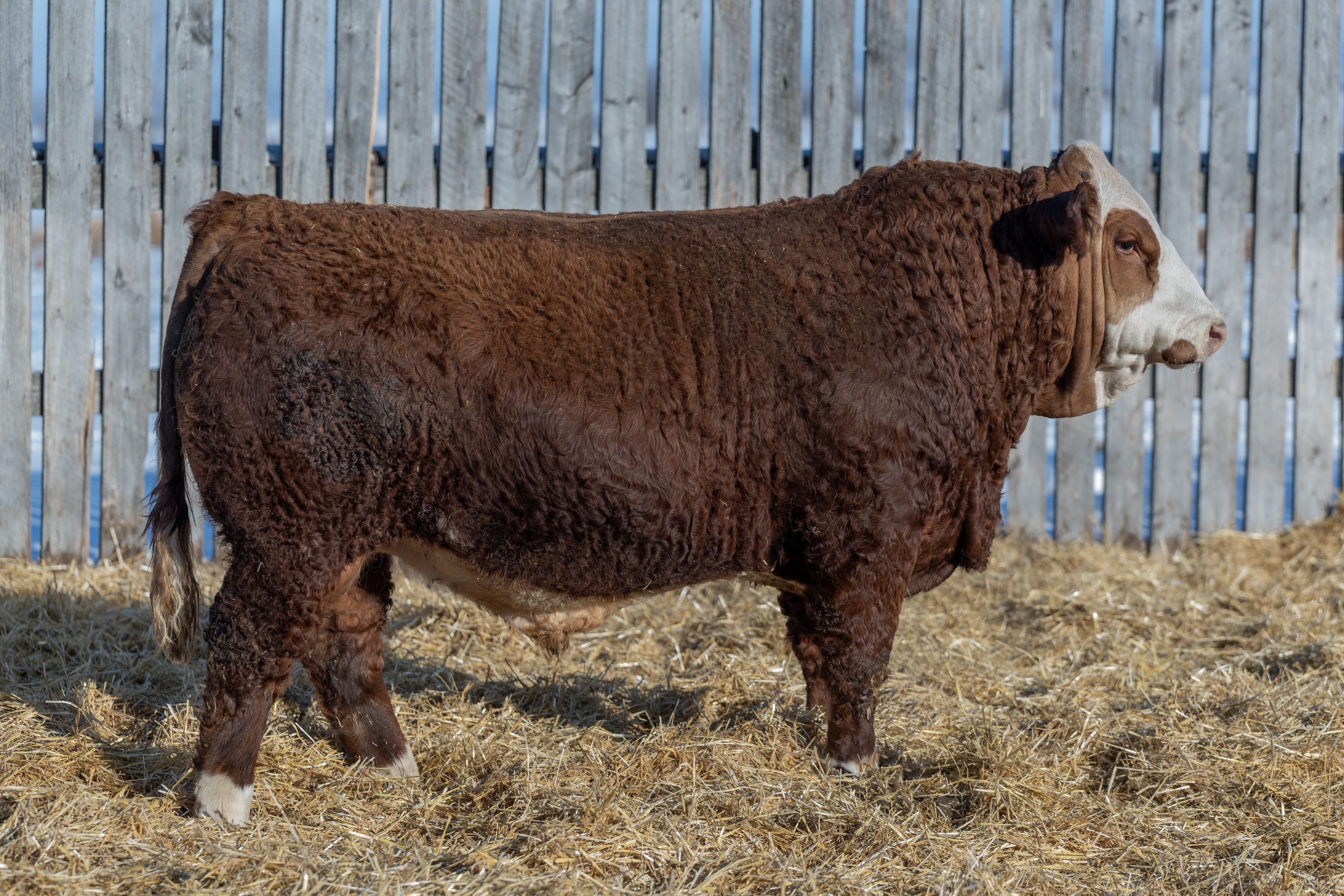 Sire Verified. Heterozygous Polled/s. Dilutor Free. 100% Fleckvieh. Our biggest ‘curve bender’, Tonka is one cool dude. Starting with a 93lb birthweight, he has exploded since weaning, and was our top performing bull when we took yearling weights in mid-January. His dam, Applecross Darla, has quickly become one of our top young cows, with a maternal sister selling to Grady Brown from Shades 2024, and a full brother to Moonlite Farms at Red Deer 2025. Darla maintains an absolutely picture perfect udder, and is just entering her prime. We have walked six generations of the cow family behind Tonka here at Applecross. Backed by such a strong cow family, and carrying a little different genetic twist, Tonka is a well balanced bull that exhibits a great quarter, strong top, and plenty of middle to form a complete package.