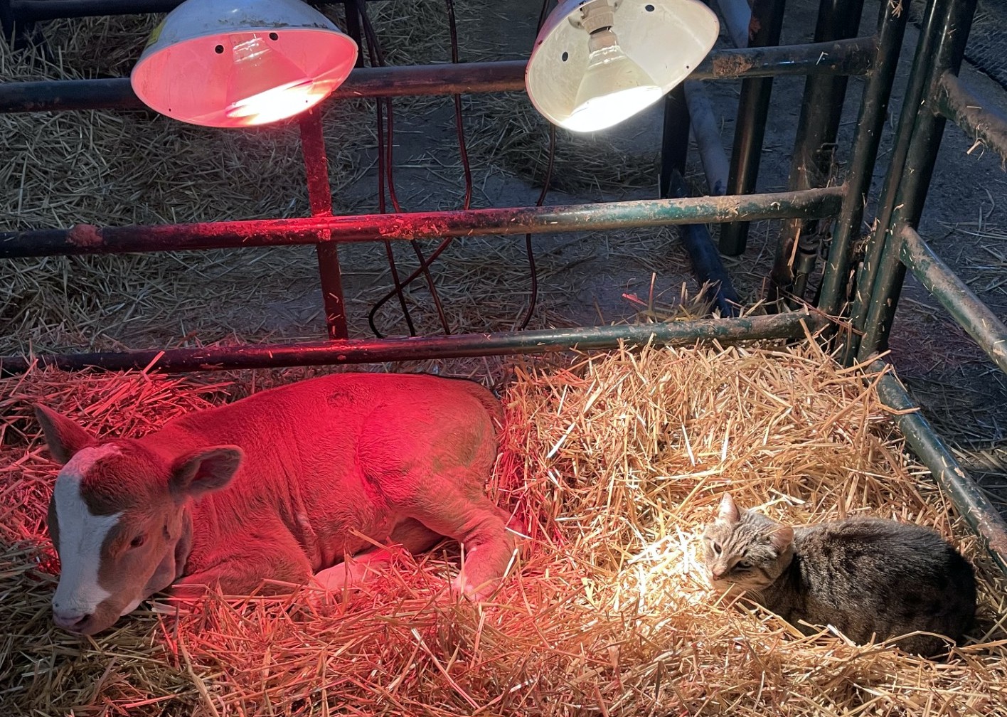 After finding some straw to make the little calf a nest under a couple of heat lamps, we could finally take a temperature. It was a little low, but not near as cold as we feared. We took a few minutes to assess overall health. Certainly not much hair, the hooves were still soft, and we weren’t sure that eyesight was fully functional (yet). We were happy to determine it was a heifer though. For whatever reason, we have found heifer calves born of trauma tend to have more ‘fight’ in them (and are typically at the other end of the spectrum of ‘big dumb bulls’)…so seeing that she was lively and a heifer did give us a little more hope. We have always been told that getting some milk in the calf was also vital. We weren’t stocked for calving yet, but a frantic call to a neighbour found some colostrum close at hand (thanks Stacey!). With the calf so small, we only made up a partial dose, as we knew she’d only have a tiny tummy.